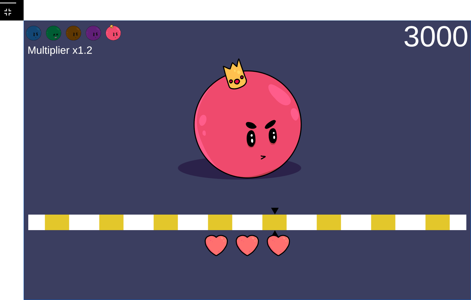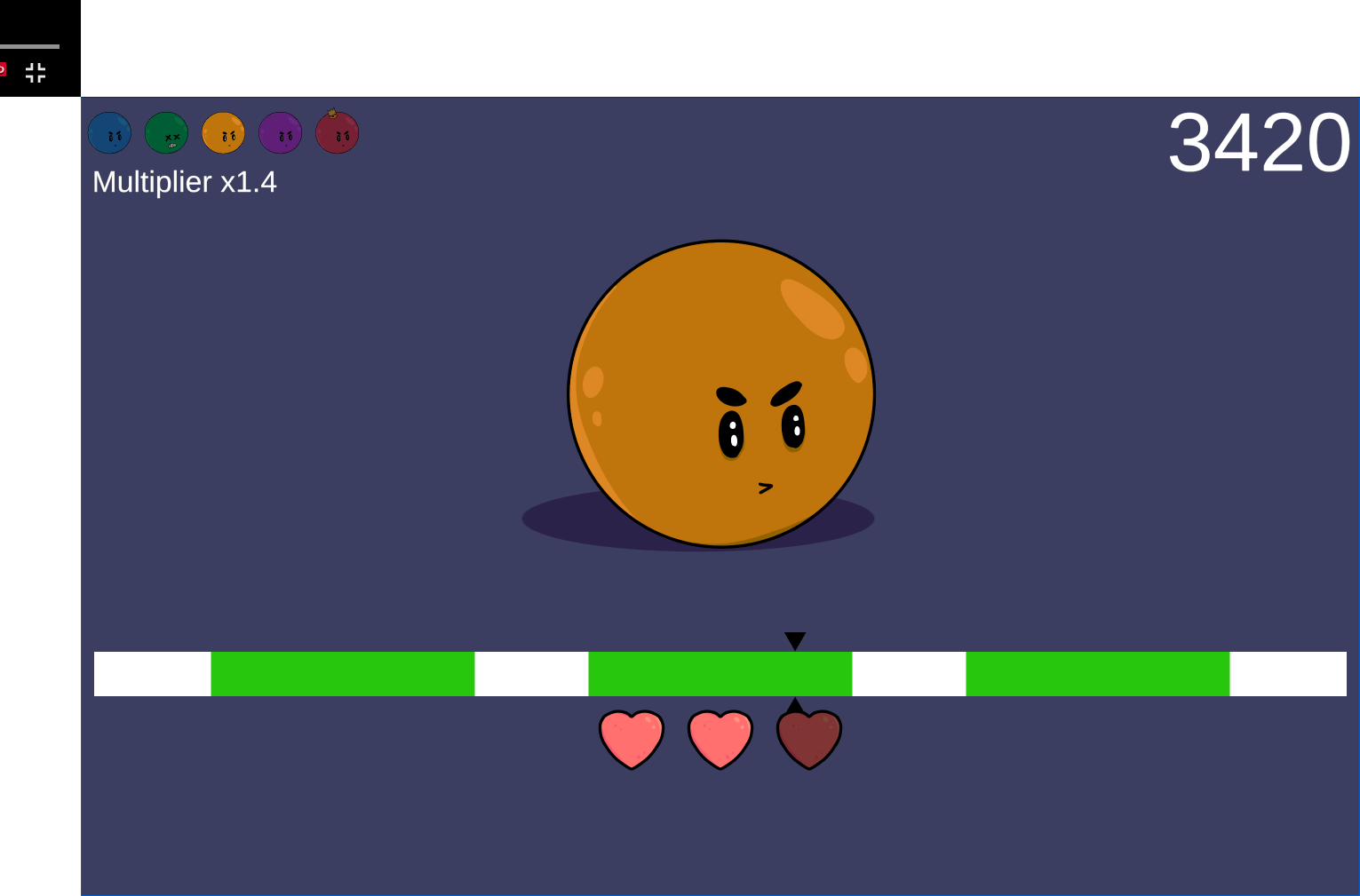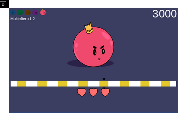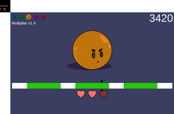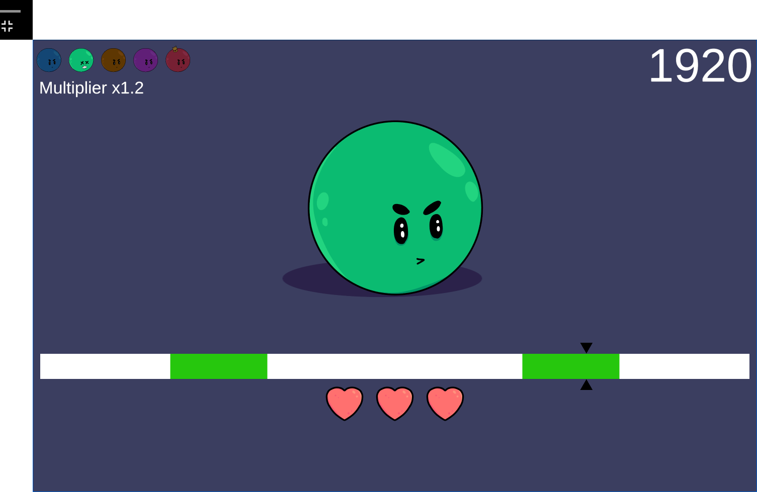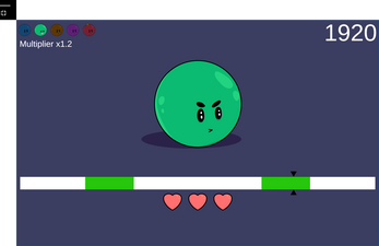 Press spacebar to attack while the indicator is within the shrinking colored area. Defeat slimes by attacking these "hit zones" to earn points. Every time you defeat all the slimes, the game will get faster, and you will earn more points per slime. How far can you go?